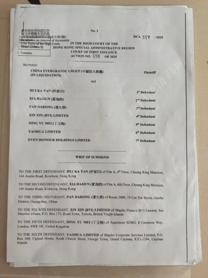 今年3月,中国恒大清盘人起诉创始人许家印、许家印前妻丁玉梅、前行政总裁夏海钧及多家相关公司共7名被告。