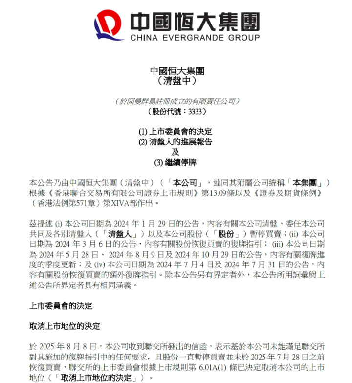 2025年8月12日,中国恒大宣布摘牌——