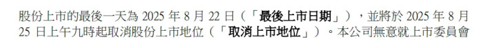 股份上市的最后一天为2025年8月22日,并将于8月25日上午9时起取消股份上市地位。中国恒大表示,公司无意就上市委员会作出取消上市地位的决定申请复核。