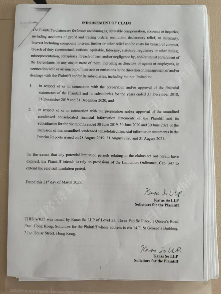 《每日经济新闻》记者从香港高等法院获取的起诉书显示,清盘人认为被告在管理中国恒大期间,因批准了2018至2020年的年度财务报表,以及批准2019至2021年未经审计的中期财务报表,涉嫌违反责任,因此提出索赔。